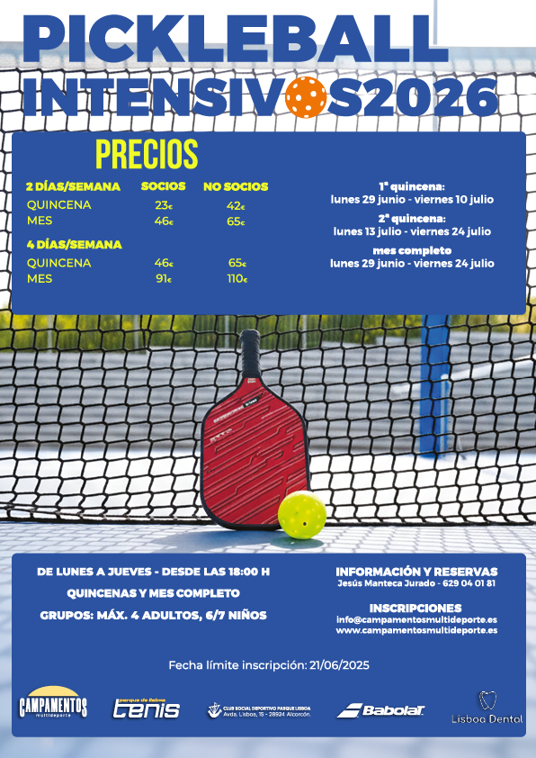 CURSO INTENSIVO DE PICKLEBALL MES DE JULIO: ofertamos clases de pickleball durante el mes de julio por quincenas o mes completo, de lunes a jueves en horario de tarde, eligiendo 2 ó 4 días/semana. Todos nuestros profesores poseen titulación oficial y están altamente cualificados. Las Escuela de tenis y pickleball estarán coordinadas y supervisadas por: